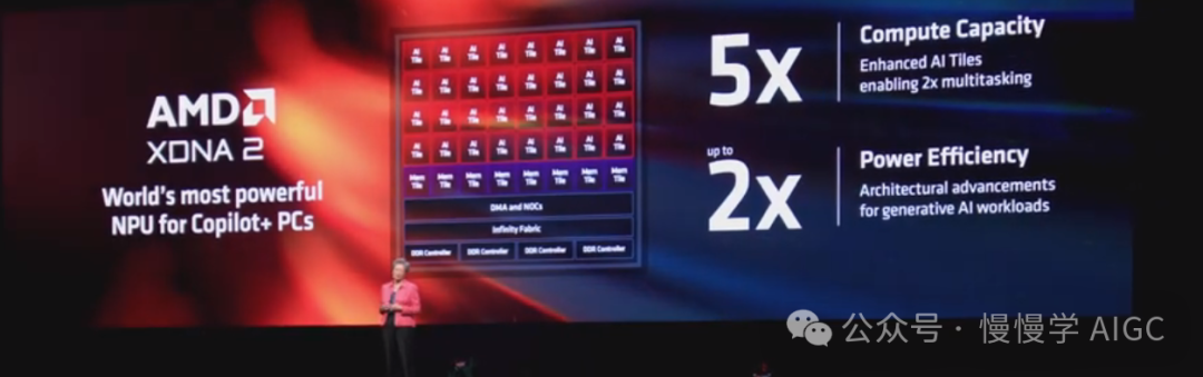 与上一代相比,XDNA 2 拥有 32 个 AI 阵列,多任务处理性能翻倍。这也是一种极其高效的架构,在运行生成式 AI 工作负载时,能效比上一代提高两倍。