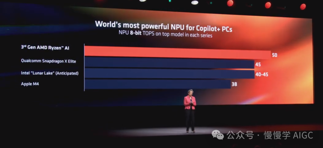 与市场上其他搭载新 NPU 的芯片进行对比,XDNA 2 提供了最高的 INT8 AI 性能(再次强调 50TOPS)。