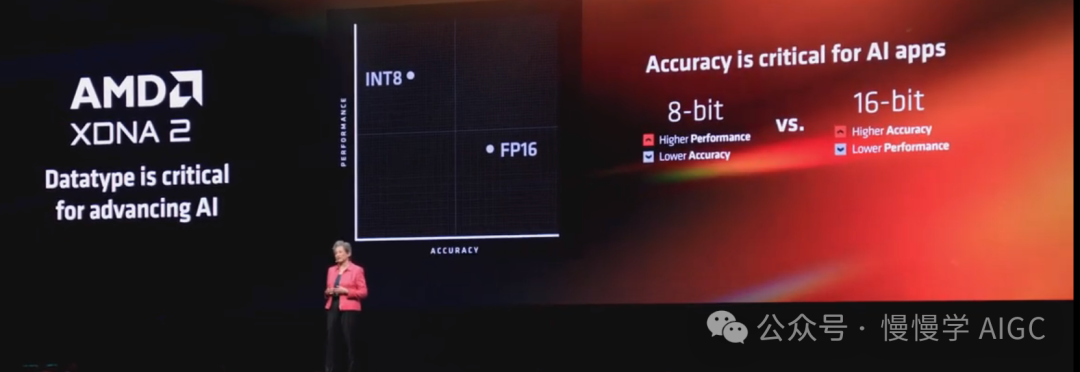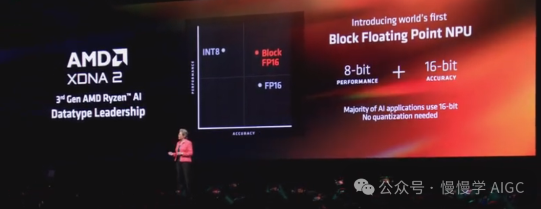 现在 XDNA 2 是第一款支持区块 16 位浮点数据类型的 NPU。这意味着区块 FP16 结合了 16 位数据的精度和 8 位数据的性能。