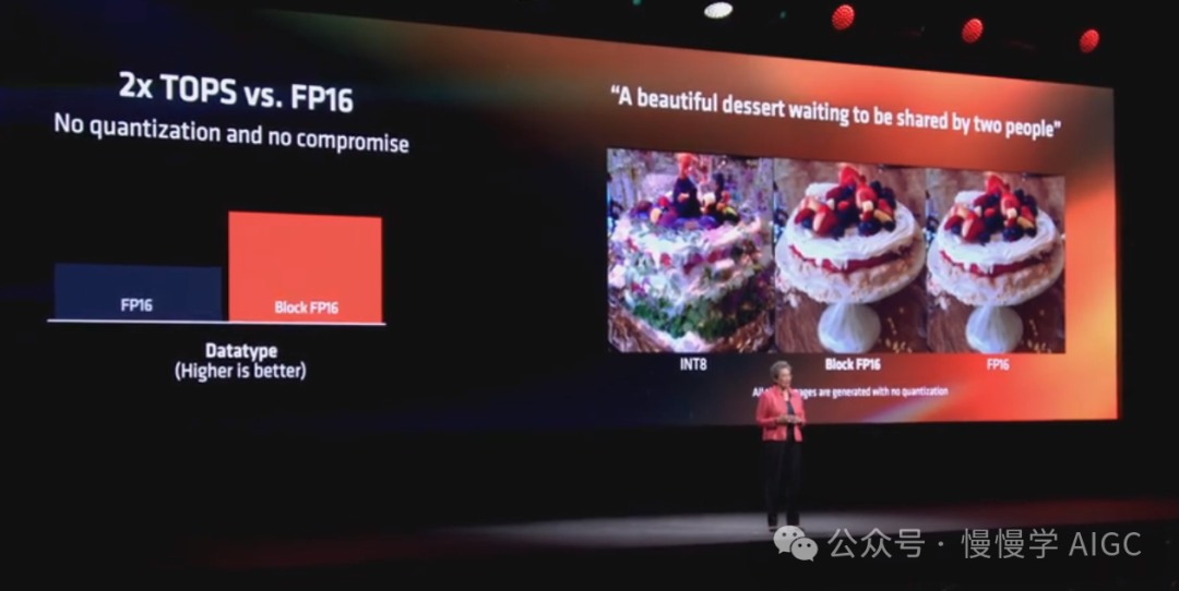 这些是使用流行的 Stable Diffusion XL Turbo 生成 AI 模型生成的三张图像。使用相同的提示,没有任何量化或重新训练,唯一的区别就是数据类型。左边是 INT8,这是大多数 NPU 所使用的数据类型。中间是区块 FP16,是 XDNA 2 所支持的数据类型。右边则是更传统的 FP16 格式。可以看到,两张 16 位数据类型生成的图像看起来要好得多,而两者之间实际上没有明显区别。Ryzen AI 可以在生成低质量 INT8 图像所需的相同时间内生成质量明显更高的图像。
