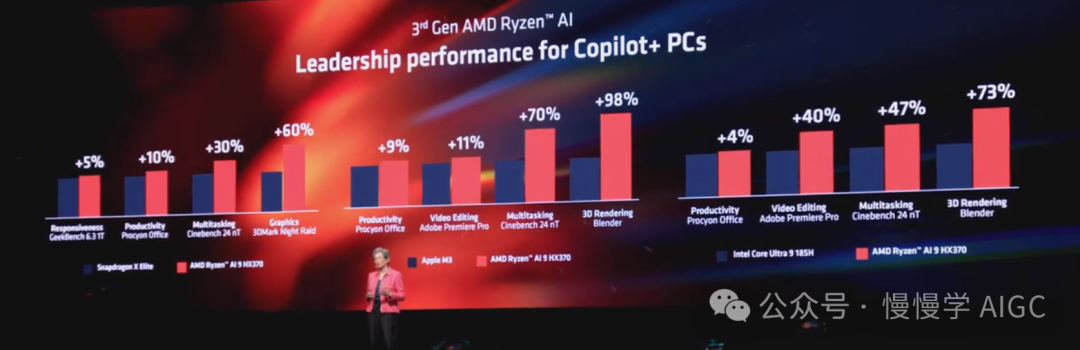 无论单线程响应能力、生产力应用、内容创作还是多任务处理能力,第三代 Ryzen AI 处理器在广泛的使用场景中,其性能领先竞争对手两位数的百分比。