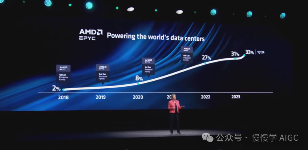 AMD 在 2017 年推出了 EPYC,随着每一代产品,越来越多的客户采用了EPYC,因为领先的性能、领先的能源效率和领先的总体拥有成本。苏妈自豪地说,AMD 现在占有 33% 的市场份额,并且还在增长。