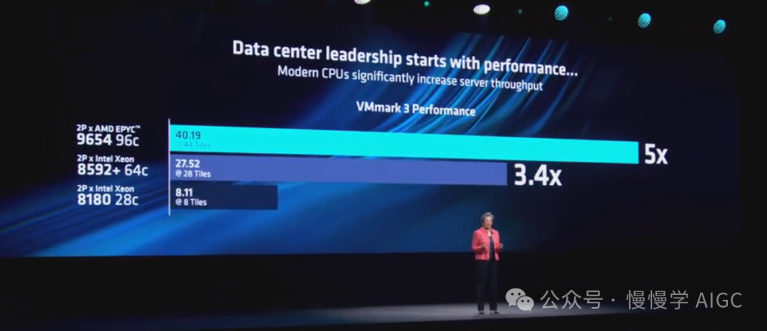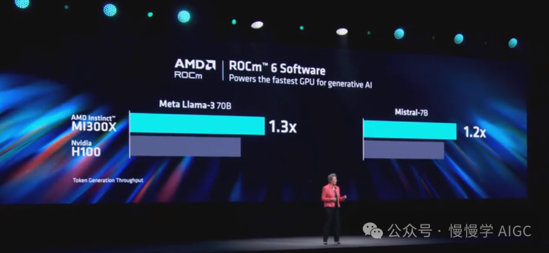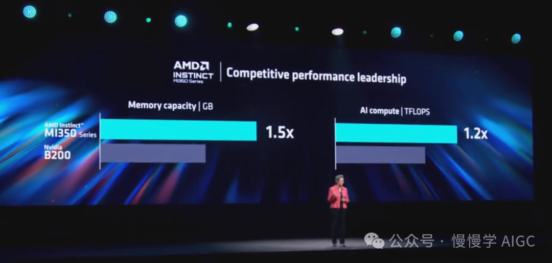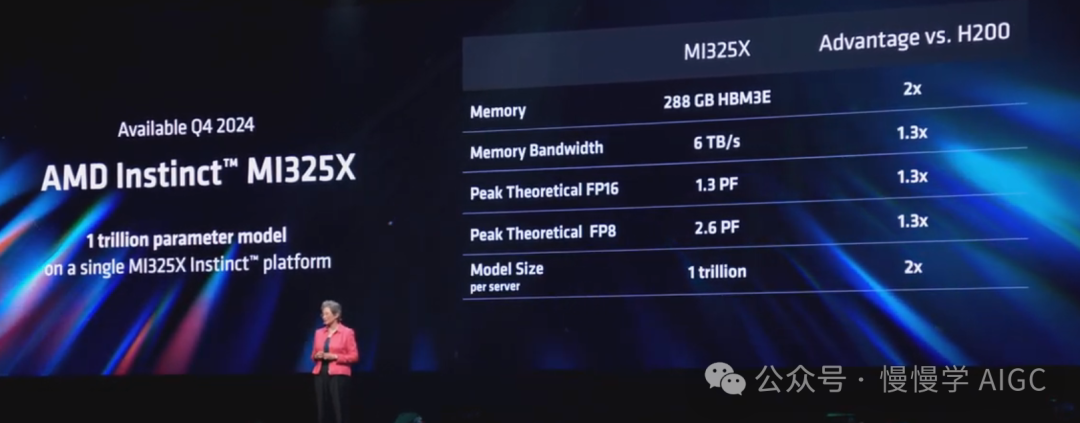 苏妈展示了一些数据。与竞品相比,MI325X 提供了两倍的内存、1.3 倍的更快内存带宽和 1.3 倍的更高峰值计算性能。