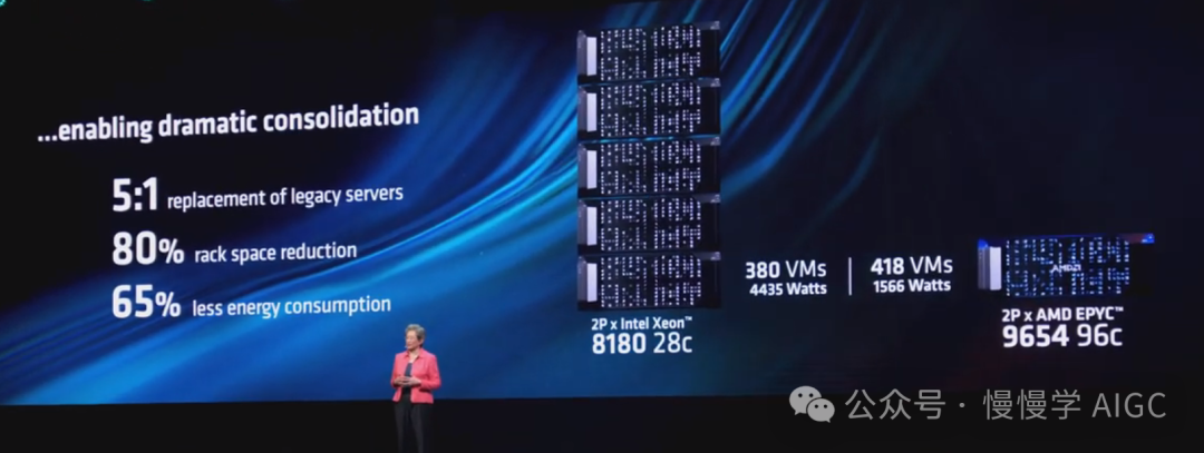 如今许多企业实际上都在寻求现代化其通用计算基础设施并在同一空间内添加新的 AI 功能。通过使用第四代 EPYC 进行数据中心更新,可以做到这一点。实际上可以用一台服务器取代五台传统服务器,从而减少 80% 的机架空间,并消耗 65% 更少的能源。