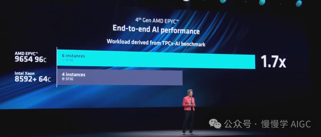 许多企业客户还希望在不添加 GPU 的情况下运行结合通用和 AI 工作负载。在运行业标准 TPCx-AI 基准测试时(该测试跨不同用例和算法测量端到端 AI pipeline 性能),EPYC 的速度比竞争对手快 1.7 倍。
