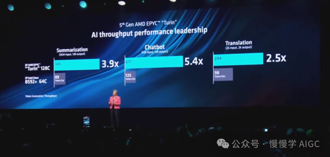 除了在总结性能上的领先地位外,Turin 在许多其他企业 AI 用例中也展现出领先性能,包括在翻译大型文档时性能提高 2.5 倍,在运行支持聊天机器人时性能提高 5 倍以上。