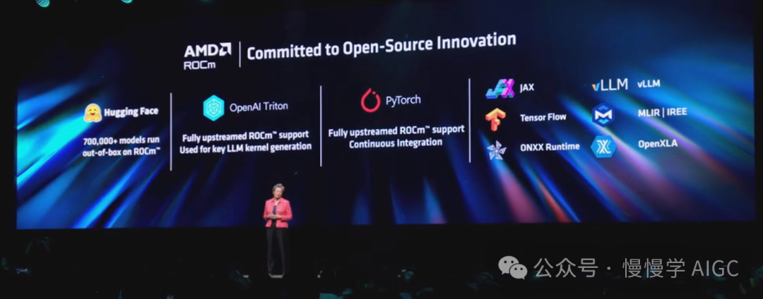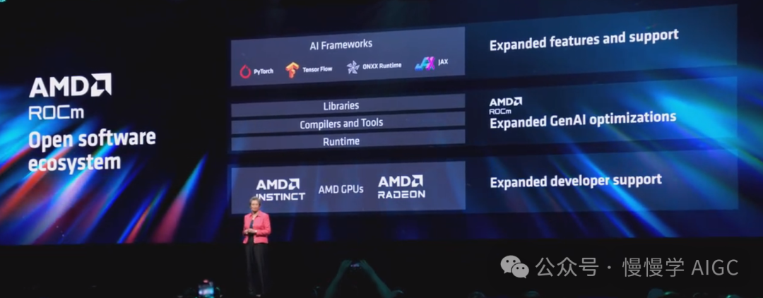 在过去一年里,AMD 在 ROCm 软件栈方面取得了巨大进展,与开源社区在每个层面紧密合作,同时添加了新功能,使客户能够非常轻松地在其软件环境中部署 AMD Instinct。
