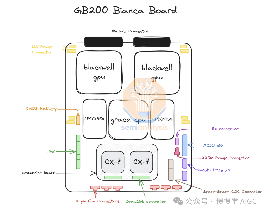 在 GB300 中,英伟达提供的供应链和内容发生了巨大变化。对于 GB200,英伟达提供完整的 Bianca 主板(包括 Blackwell GPU、Grace CPU、512 GB 的 LPDDR5X 内存、集成在一块 PCB 上的电压调节模块内容),以及交换机托盘和铜质背板。