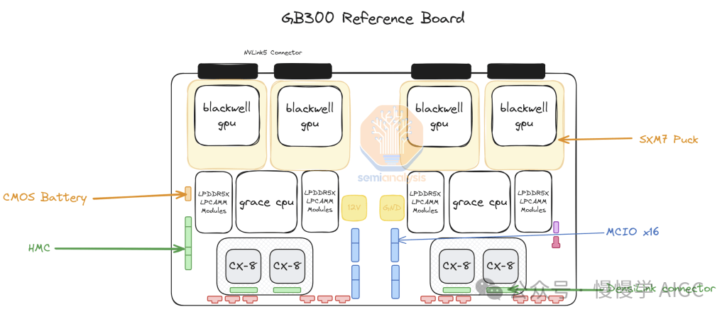 对于 GB300,英伟达不再提供完整的 Bianca 主板,而是只提供安装在"SXM Puck"模块上的 B300、BGA 封装的 Grace CPU,以及 HMC(主板管理控制器)——这次改用美国初创公司 Axiado 的产品,而不是 GB200 使用的 Aspeed 产品。