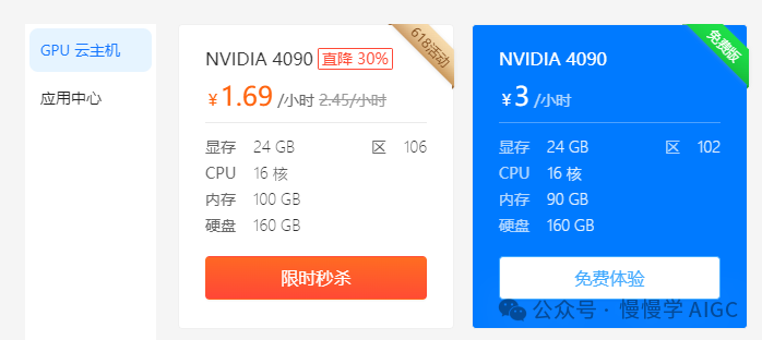 在 GPU 云主机页面,点击第二个卡片“免费体验”创建 NVIDIA 4090 免费版实例。