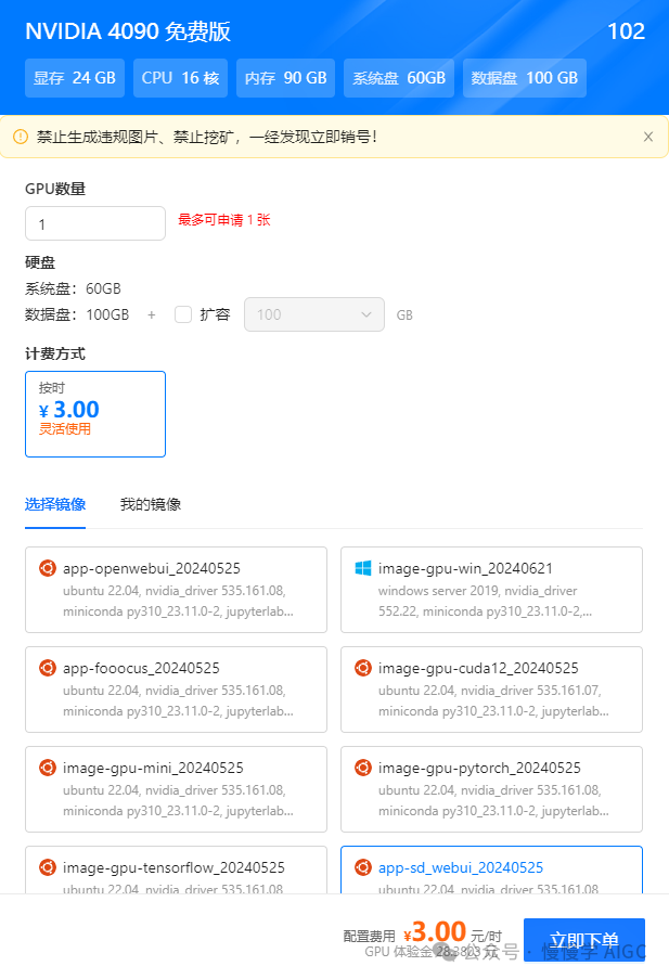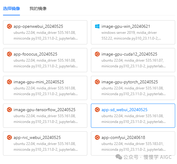 前面保持默认,镜像使用这个 app-sd_webui_20240525,内置了 SD WebUI 的基础环境,可以省去自己搭建环境的麻烦: