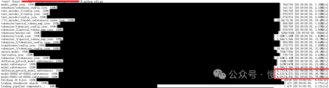 执行 python sd3.py,首次运行会下载 SD3 权重,速度还可以。