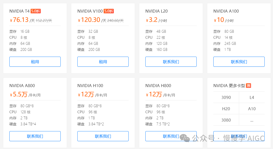 除了 4090,他们家也有 A100, A800, H800 等高端 GPU,适合大规模分布式训练任务,要联系商务开通。这里就不多介绍了。