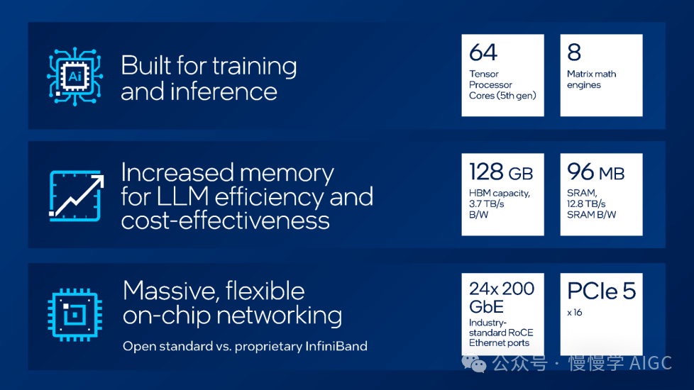 增强性能:Gaudi 3 拥有 4 倍的计算能力、2 倍的网络带宽和 1.5 倍的 HBM 内存带宽,确保在使用大型语言模型时性能稳健,不会出现降级。