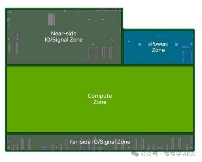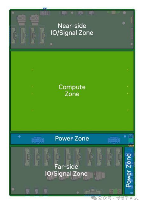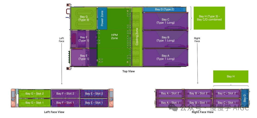 MGX 架构本质上是模块化的。它由位于热通道和冷通道两侧的可配置机箱盒位组成,可以用模块装配以实现所需配置。在内部,系统为主要子系统划分区域:HPM、电源分配板、冷却解决方案和模块盒位。