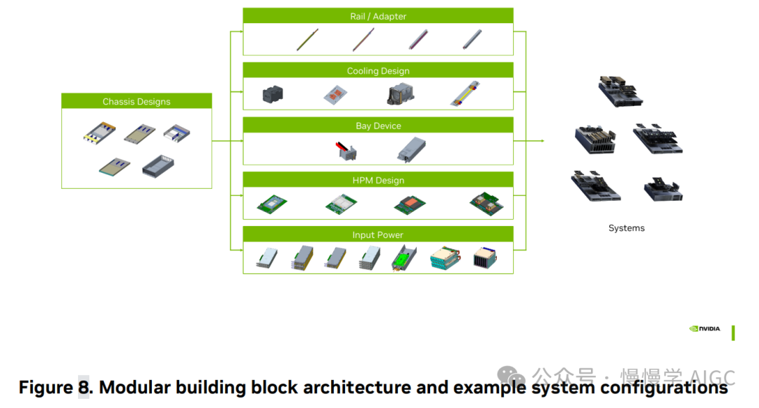 MGX 架构构建出一个由模块化机箱、HPM、电源分配板、冷却解决方案等基本构建模块组成的生态系统,并专门设计以适配19英寸机箱。如图8所示,这些构建模块可以以100多种方式组装,形成独特的系统设计,以满足服务器的特定需求。