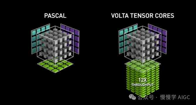 带有和不带有 Tensor Core 的 Pascal 和 Volta 计算的可视化
