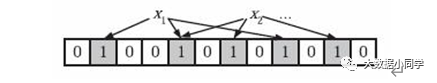 为了表达S={x1, x2,…,xn}这样一个n个元素的集合,Bloom Filter使用k个相互独立的哈希函数(Hash Function),它们分别将集合中的每个元素映射到{1,…,m}的范围中。对任意一个元素x,第i个哈希函数映射的位置hi(x)就会被置为1(1≤i≤k)。注意,如果一个位置多次被置为1,那么只有第一次会起作用,后面几次将没有任何效果。如图所示,k=3,且有两个哈希函数选中同一个位置(从左边数第五位)。