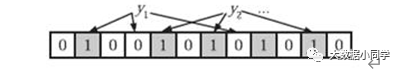 在判断y是否属于这个集合时,我们对y应用k次哈希函数,如果所有hi(y)的位置都是1(1≤i≤k),那么我们就认为y是集合中的元素,否则就认为y不是集合中的元素。如图所示y1就不是集合中的元素。y2或者属于这个集合,或者刚好是一个false positive。