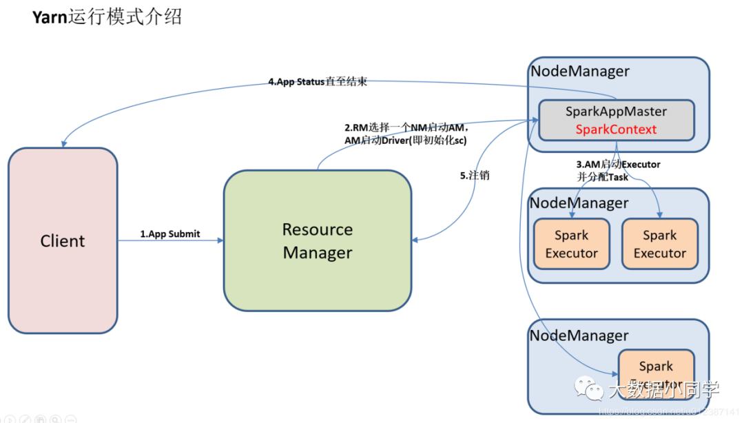 Spark客户端直接连接Yarn,不需要额外构建Spark集群。有yarn-client和yarn-cluster两种模式,主要区别在于:Driver程序的运行节点。