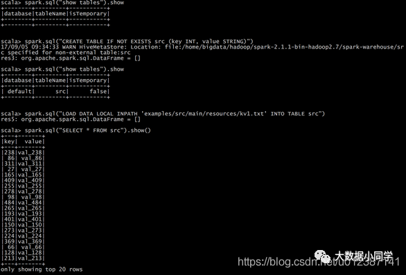 注意:如果你使用的是内部的Hive,在Spark2.0之后,spark.sql.warehouse.dir用于指定数据仓库的地址,如果你需要是用HDFS作为路径,那么需要将core-site.xml和hdfs-site.xml 加入到Spark conf目录,否则只会创建master节点上的warehouse目录,查询时会出现文件找不到的问题,这是需要使用HDFS,则需要将metastore删除,重启集群。