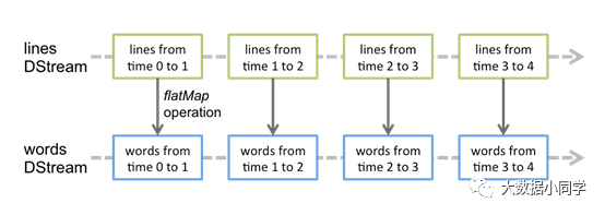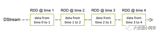 Discretized Stream是Spark Streaming的基础抽象,代表持续性的数据流和经过各种Spark原语操作后的结果数据流。在内部实现上,DStream是一系列连续的RDD来表示。每个RDD含有一段时间间隔内的数据,如下图: