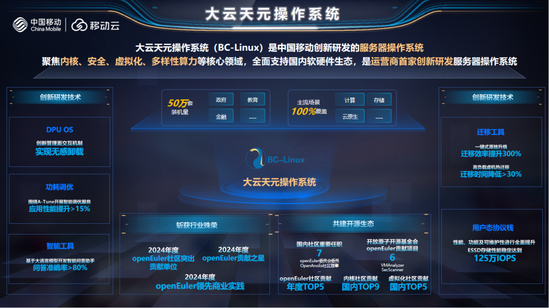 大云天元操作系统(BC-Linux)是中国移动为满足业务发展需求、实现基础软件核心技术创新而研发的服务器操作系统,聚焦内核、虚拟化、安全等领域核心技术能力的锻造。自2015年启动研发以来,大云天元操作系统已累计发布22个版本,全面支持中国软硬件生态,适配6大CPU架构,是运营商首家创新研发的服务器操作系统,为中国移动构建了安全可靠的数字基础设施底座。