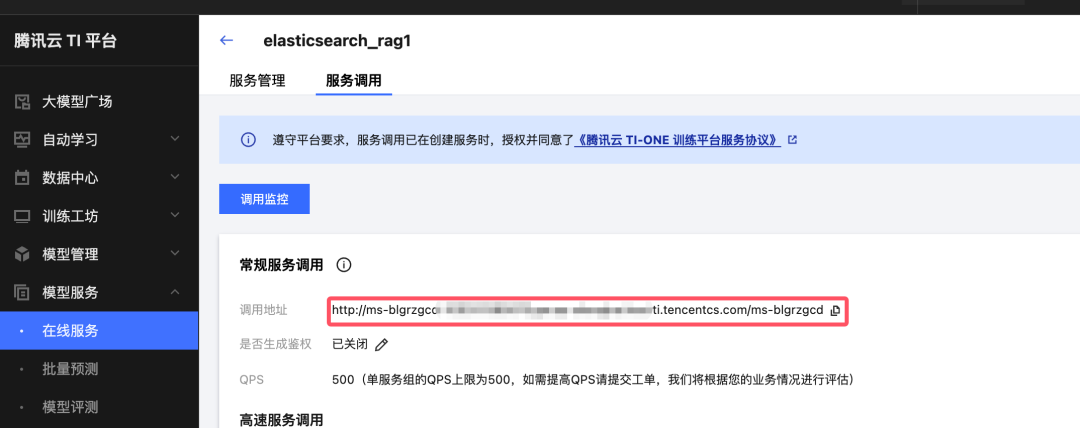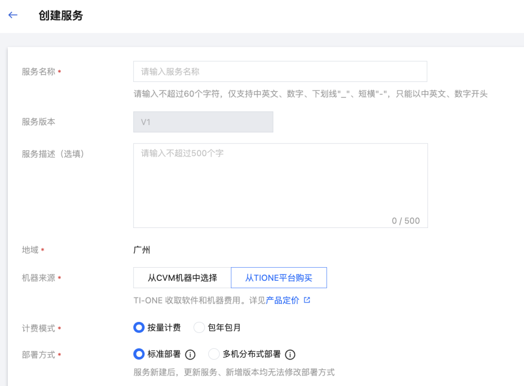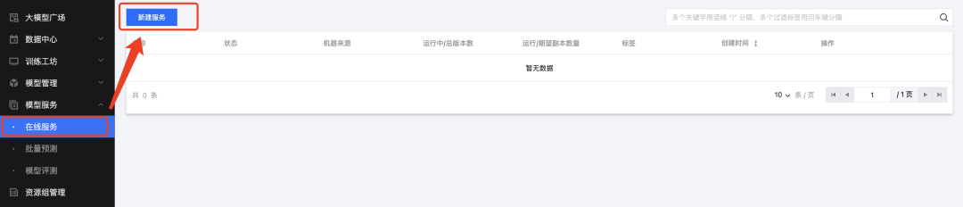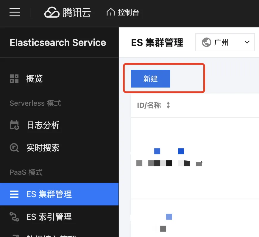 2、进入在线服务界面,点击新建服务,注意地域需与ES集群一致,本文将服务部署到广州地域: