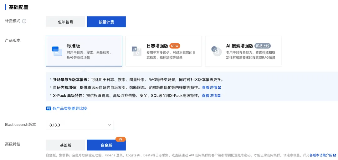 3、计费模式为按量计费,产品版本为标准版、ES 版本为 8.13.3、商业特性为白金版: