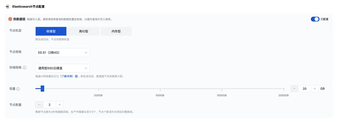 ES 节点配置,测试环境可选择为ES.S1(4核8G),节点数为2,磁盘为通用型SSD,磁盘容量为 20GB: