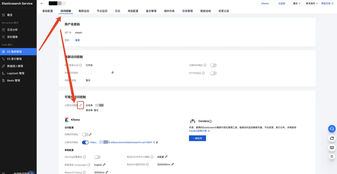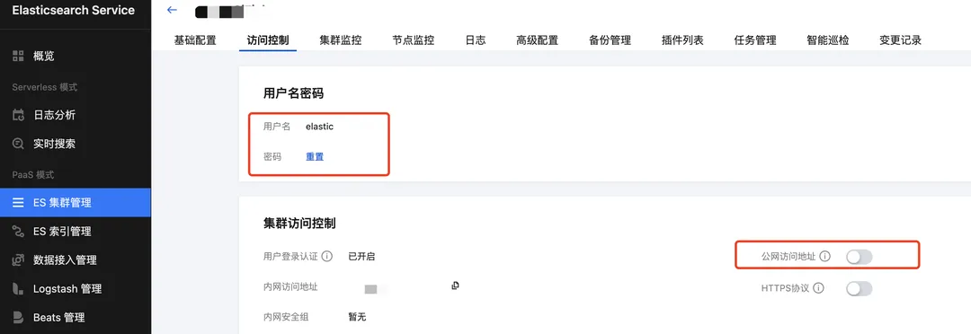 用户名为 elastic、密码在创建集群时设置,用本地mac测试时,可开启公网访问,实际生产时,建议使用内网访问地址。