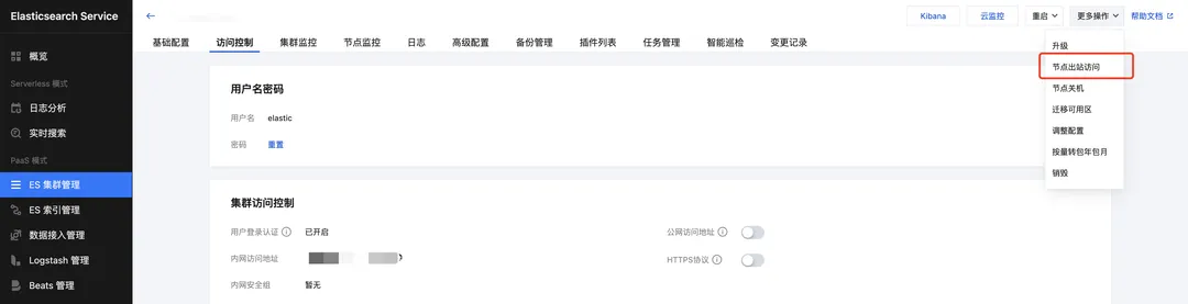1、开启「节点出站访问」,仅开启数据节点即可,如有专用主节点,仅开启专用主节点即可。(该功能为白名单,请联系工单处理):