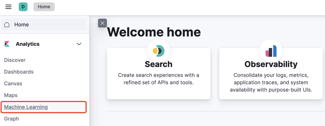 2、登录Kibana之后,在左侧导航栏找到Machine Learning功能: