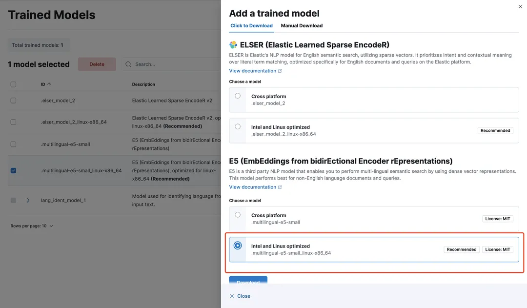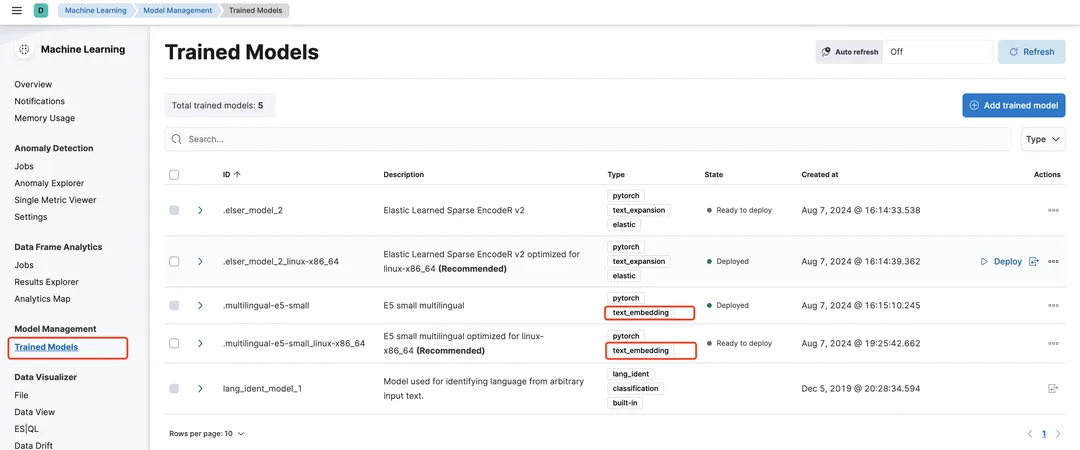 4、如为未下载状态,选中模型,并点击Add trained model,本次演示我们使用.multilingual-e5-small模型,这是一个 384 维的多语言模型: