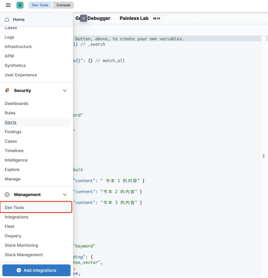在集群购买完成后,就可以前往Kibana部署Embedding模型、创建知识库索引与向量化管道: