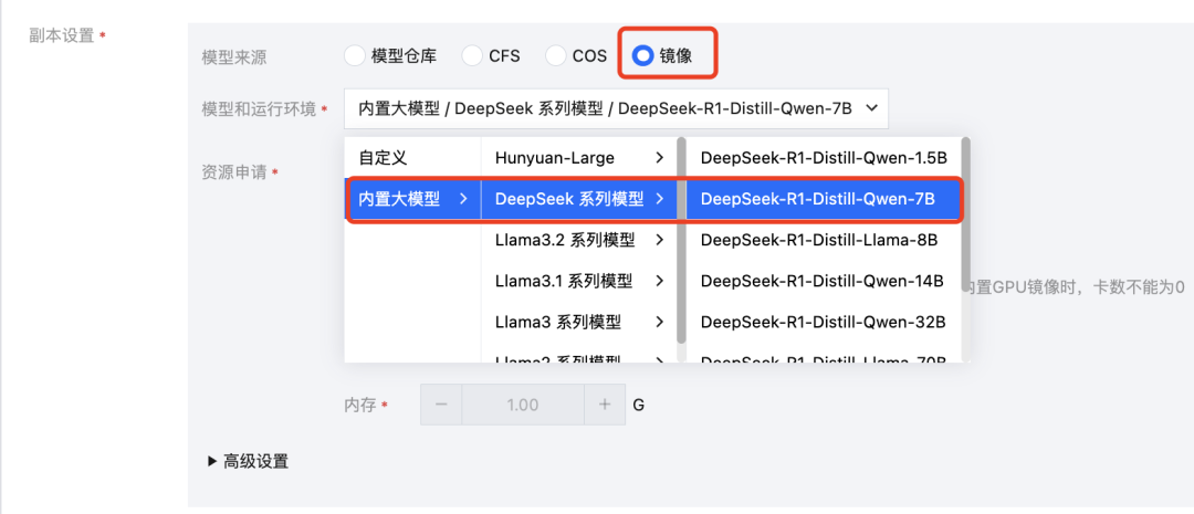 ●模型和运行环境选择内置大模型->DeepSeek系列模型->DeepSeek-R1-Distill-Qwen-7B