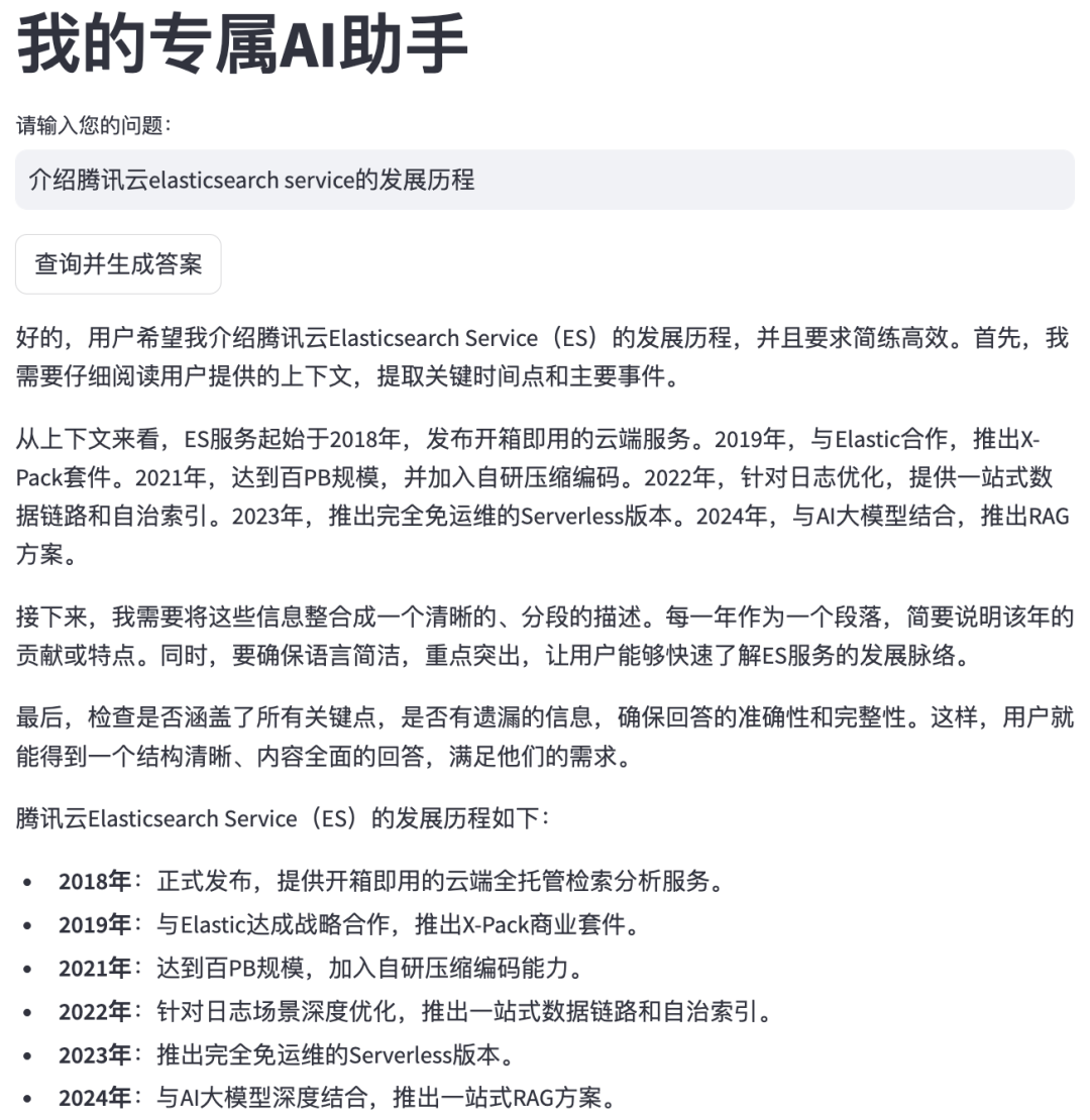 import streamlit as stfrom elasticsearch import Elasticsearchfrom tione_ds import deepseek_gptes_client = Elasticsearch("ES集群访问地址",basic_auth=("用户名", "密码"))def get_elasticsearch_results(query):es_query = {"knn": {"field": "content_embedding","num_candidates": 100,"query_vector_builder": {"text_embedding": {"model_id": ".multilingual-e5-small","model_text": query}}},"query":{"match":{"content":query}},"rank":{"rrf":{"window_size":100,"rank_constant":20}}}result = es_client.search(index="index-name", body=es_query)return result["hits"]["hits"]def create_deepseek_prompt(results,question):context = ""for hit in results:source_field = hit["_source"]["content"]hit_context = source_fieldcontext += f"{hit_context}\n"prompt = f"""Instructions:结合{context}的信息回答{question}的问题,要求简练高效"""return promptdef generate_deepseek_completion(user_prompt, question):response = deepseek_gpt(user_prompt, question)print(str(response))return response.replace('<think>','').replace('</think>','')def format_result(hit):title = hit["_source"]["title"]return f'[{title}]'def main():st.title("我的专属AI助手")# 创建输入框和查询按钮question = st.text_input("请输入您的问题:")if st.button("查询并生成答案"):# 获取Elasticsearch结果并创建HunYuan提示elasticsearch_results = get_elasticsearch_results(question)user_prompt = create_deepseek_prompt(elasticsearch_results,question)system_prompt = f"""你是一个问答任务的助手。使用呈现的上下文实事求是地回答问题。"""# 使用deepseek模型生成回答openai_completion = generate_deepseek_completion(system_prompt, user_prompt)# 显示结果st.write(openai_completion)# 展示Elasticsearch查询结果st.write("大模型参考的文档:")for hit in elasticsearch_results:st.markdown(format_result(hit))if __name__ == "__main__":main()