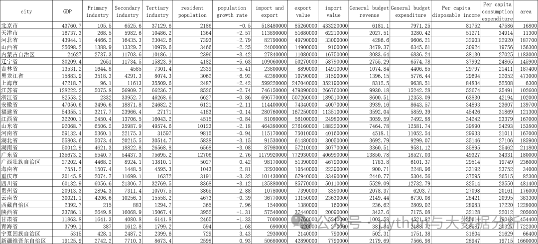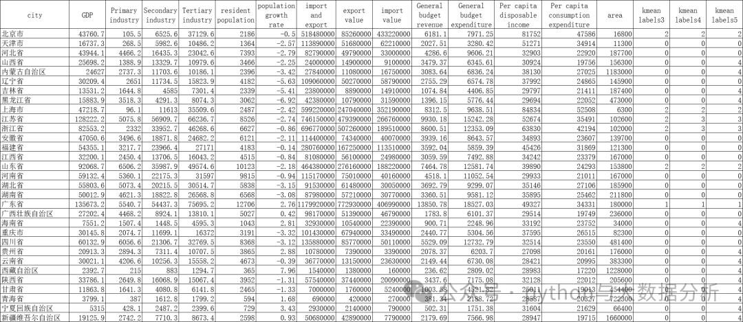 关于聚类结果问题,很难说有一个明确的结论,每个人看待数据都有不同的结论,例如北京、上海基本为一类,浙江、江苏、山东基本为一类,广东有些另类,河南河北山西陕西为一类,内蒙新疆西藏可以为一类,基于不同的逻辑可以分为若干类,我们这里仅做比较,不做结论。后续通过可视化方式,可以看一下