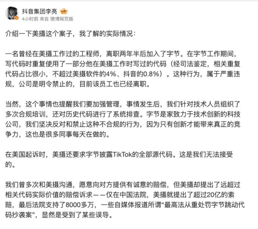 当然,抖音集团是不太愿意大家这么开心的。一方面他们不敢不尊重最终判决,一方面他们试图重新组织语言,把一个典型的代码抄袭案件包装为一个小小的管理失误。