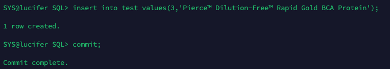 SQL> insert into test values(3,'Pierce™ Dilution-Free™ Rapid Gold BCA Protein');