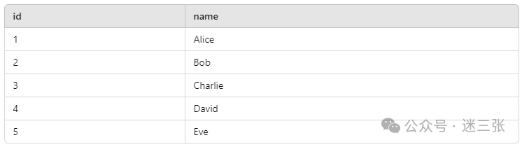 INSERT INTO t_tinylog_test (id, name) VALUES('1', 'Alice'),('2', 'Bob'),('3', 'Charlie'),('4', 'David'),('5', 'Eve');SELECT * FROM t_tinylog;