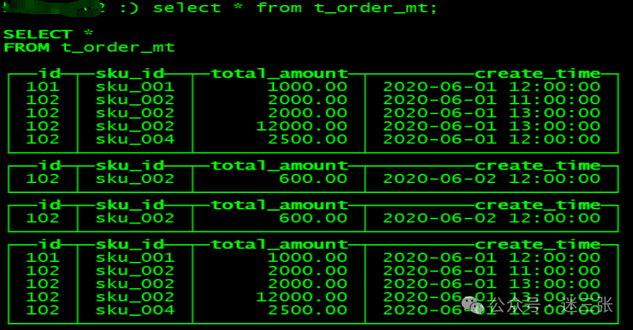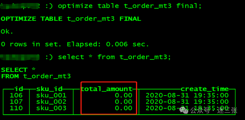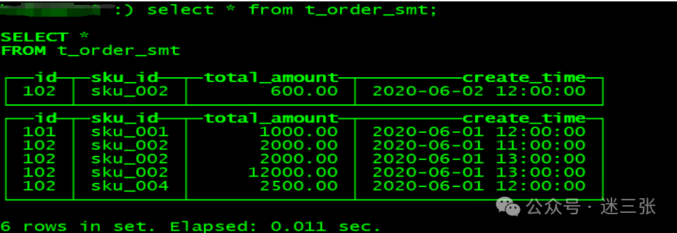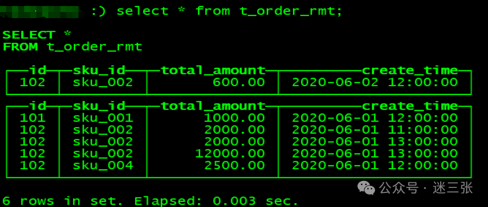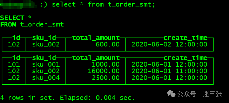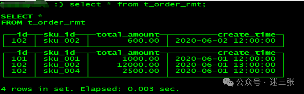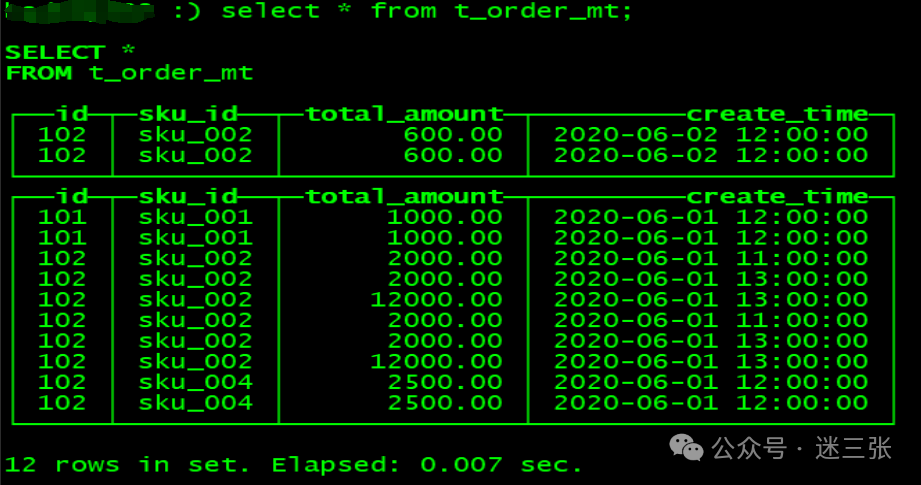 insert into t_order_rmergetree values(101,'sku_001',1000.00,'2020-06-01 12:00:00') ,(102,'sku_002',2000.00,'2020-06-01 11:00:00'),(102,'sku_004',2500.00,'2020-06-01 12:00:00'),(102,'sku_002',2000.00,'2020-06-01 13:00:00'),(102,'sku_002',12000.00,'2020-06-01 13:00:00'),(102,'sku_002',600.00,'2020-06-02 12:00:00');