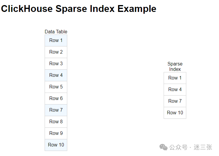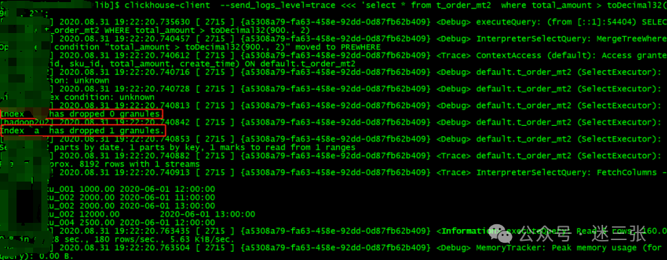 create table t_order_mergetreev2(id UInt32,sku_id String,total_amount Decimal(16,2),create_time Datetime,INDEX a total_amount TYPE minmax GRANULARITY 5) engine =MergeTreepartition by toYYYYMMDD(create_time)primary key (id)order by (id, sku_id);其中 GRANULARITY N 是设定二级索引对于一级索引粒度的粒度。