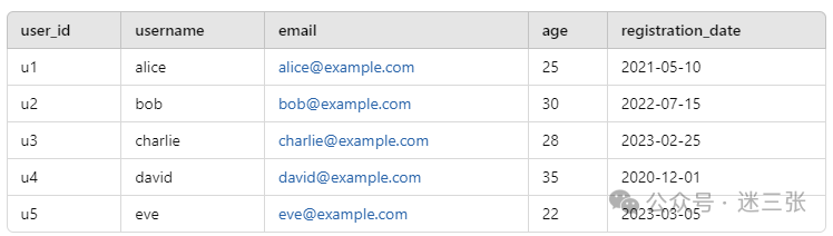 INSERT INTO t_user_info (user_id, username, email, age, registration_date) VALUES('u1', 'alice', 'alice@example.com', 25, '2021-05-10'),('u2', 'bob', 'bob@example.com', 30, '2022-07-15'),('u3', 'charlie', 'charlie@example.com', 28, '2023-02-25'),('u4', 'david', 'david@example.com', 35, '2020-12-01'),('u5', 'eve', 'eve@example.com', 22, '2023-03-05');SELECT * FROM t_user_info;