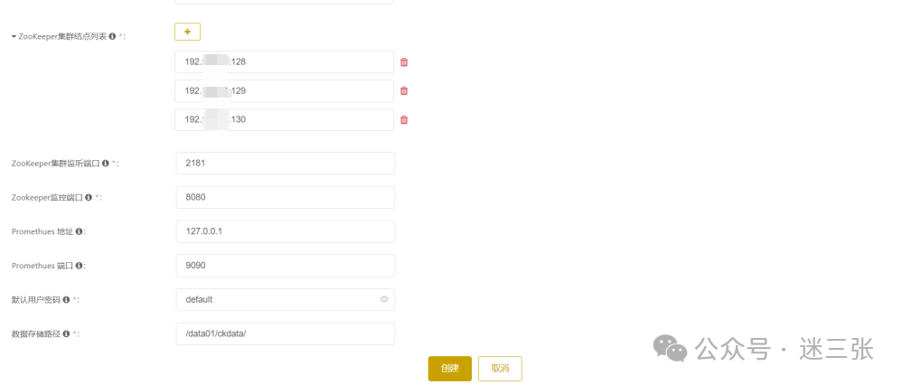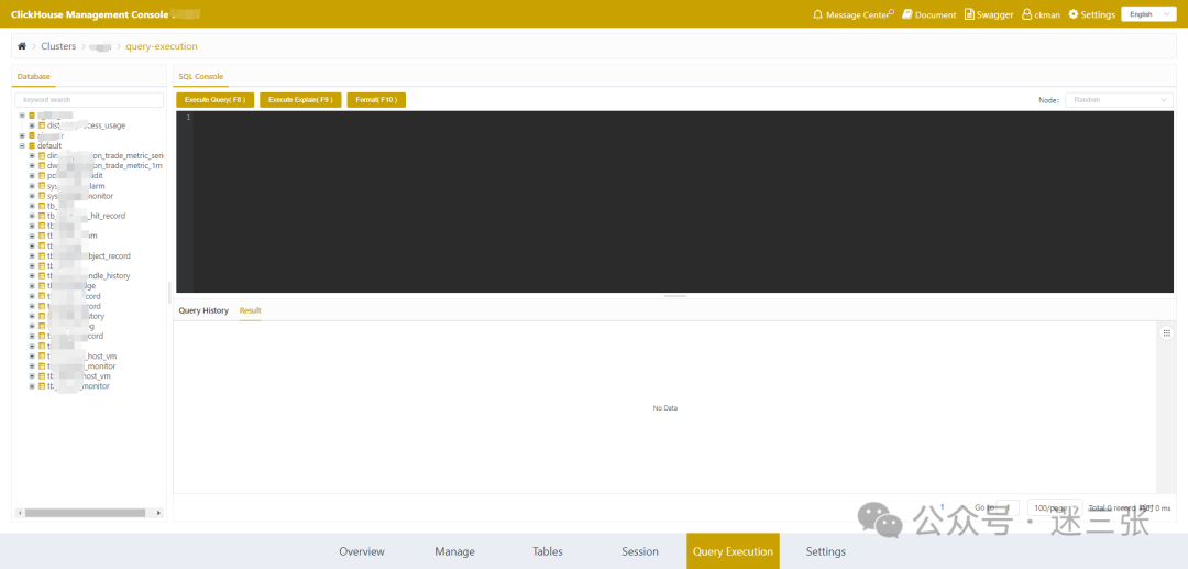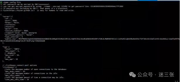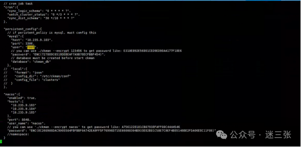 # cd /data01/ckman/conf# cat ckman.hjson// ckman config file// All password can be encrypt by ENC(xxxxxxxxx),// you can get encrypt password by using: ./ckman --encrypt 123456 to get password like: E310E892E56801CED9ED98AA177F18E6// If password not including by ENC(), that means it's a plaintext.// hjson(https://hjson.github.io/) is easy for humans to read and write.{"server":{"id": 1, # 第二台ckman写2"port": 8808,"https": false,certfile:keyfile:"pprof": true,"session_timeout": 3600,support local, mysql, postgres"persistent_policy": "mysql", # ckman多节点部署,选择mysql"task_interval": 5"public_key": MIGfMA0GCSqGSIb3DQEBAQUAA4GNADCBiQKBgQC9IARaXJGPLOLsVqHVCI9xLSna4EaKWU6nHEUOHFvYG9LbLMm9h6DY8XJsC/ieO4wRZcqQnUObuhm42Ss7lDf1Wvs9cUZaUlznt6+iby0ehwj/ikp67p3R7Njyg0LCxAbnJJYK98/cFuKm1h5x64iUb5gYvUL0Yr9zSFw2g+7Z8QIDAQAB},"log":{"level": "INFO","max_count": 5,megabyte"max_size": 10,day"max_age": 10},/ clickhouse connect pool options"clickhouse":{//sets the maximum number of open connections to the database"max_open_conns": 10,//sets the maximum number of connections in the idle"max_idle_conns": 2,//sets the maximum amount of time a connection may be idle."conn_max_idle_time": 10},// cron job task"cron":{"sync_logic_schema": "0 * * * * ?","watch_cluster_status": "0 */3 * * * ?","sync_dist_schema": "30 */10 * * * ?"},"persistent_config":{// if peristent_policy is mysql, must config this"mysql":{"host": "10.235.9.183","port": 3306,"user": "root",// you can use ./ckman --encrypt 123456 to get password like: E310E892E56801CED9ED98AA177F18E6"password": "ENC(727889C6518DEBEAF7A9B78ECFBBF454)",// database must be created before start ckman"database": "ckman_db"},// "local":{// "format": "json"// "config_dir": "/etc/ckman/conf"// "config_file": "clusters"// }},"nacos":{"enabled": true,"hosts":["10.235.9.183""10.235.9.184""10.235.9.185"],"port": 8848,"user_name": "nacos",// you can use './ckman --encrypt nacos' to get password like: A7561228101CB07938FAFF00C4444546"password": "ENC(8C260900DAC9905504FBFBBF0A742EA9FF5F76996D715E66008304B933E82B81C50E7C9EF4B85140BE2FDA06E8C11F86)",//namespace:}}