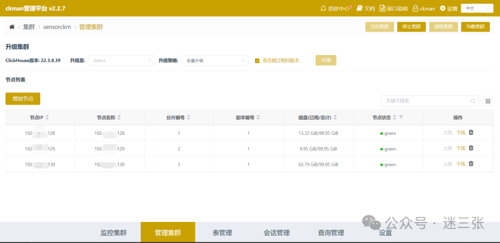 如果需要往集群增加或者删除一个节点需要我们逐一节点进行修改各个配置文件,繁琐复杂还容易出问题,所以ClickHouse的集群运维,如果靠人工去做,不仅繁琐,容易出现各种问题,当集群规模变大后,也变得不切实际。但是ckman完美的解决了这些问题,把clickhouse的运维变得简单易操作,只需要界面点击配置。