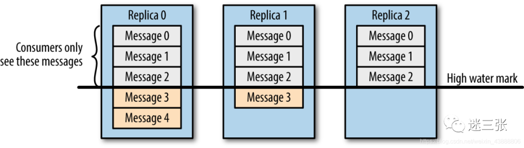 假设分区副本为3,副本0leader,副本1和2follower,在ISR列表里面副本0已经写入了message4,但是consumer只能读取message2,这是因为所有副本都同步了message2,只有High water mark以上的message才能被consumer读取,而High water mark取决于ISR列表里偏移量最小的分区,对应上图中的副本2;