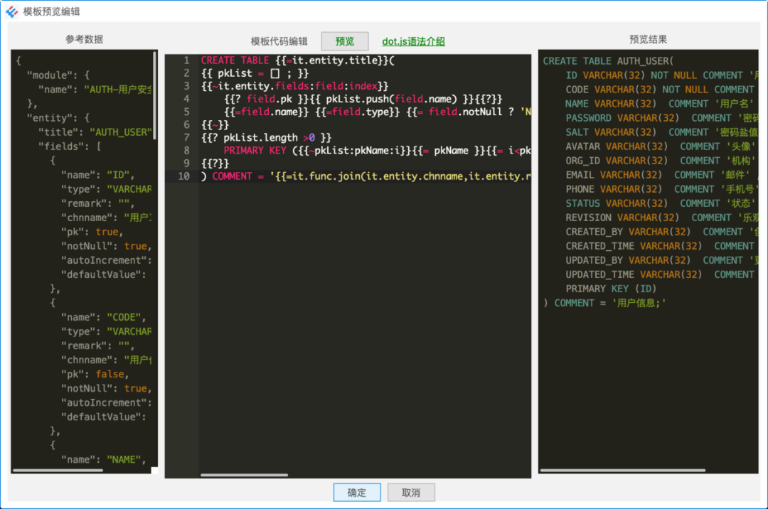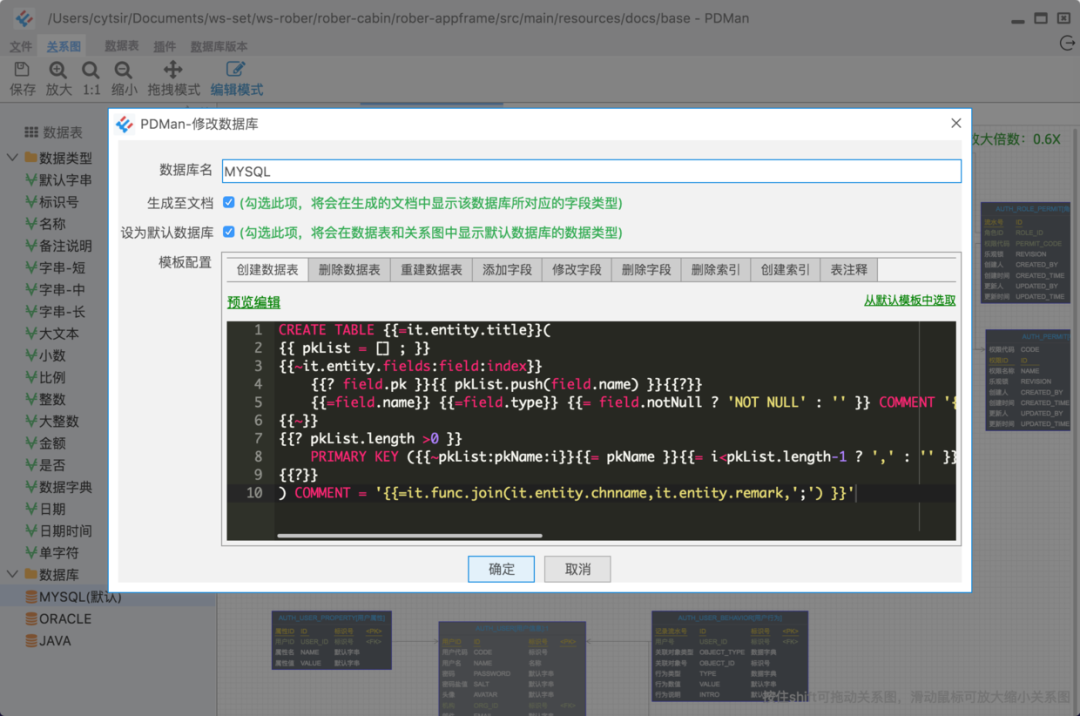 目前系统默认实现了MySQL,Oracle,Java的代码自动生成,并且带注释。其他类型的数据库或语言,只需要添加相应的“数据库”并设置好相应的doT模板就可以了。