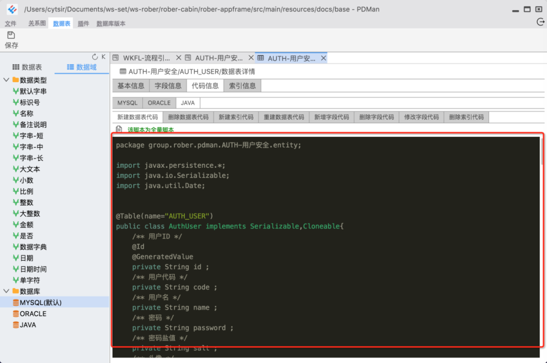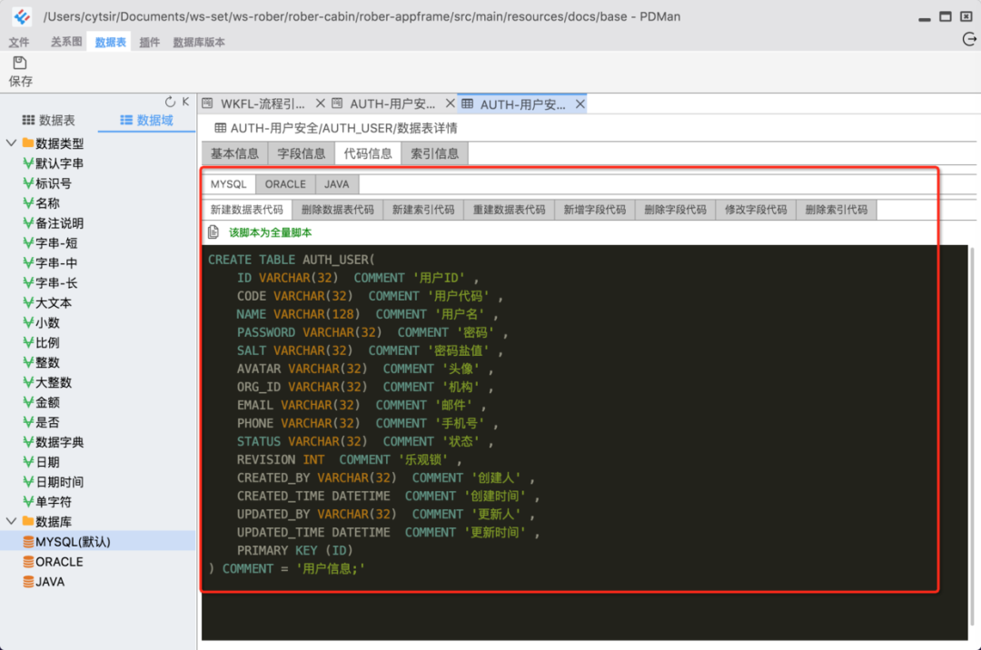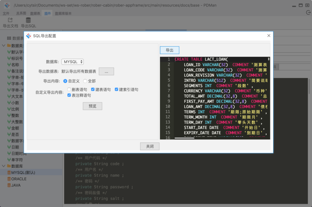 生成数据库脚本以及提供导出功能。
