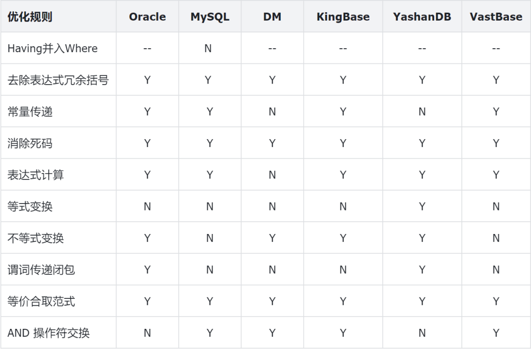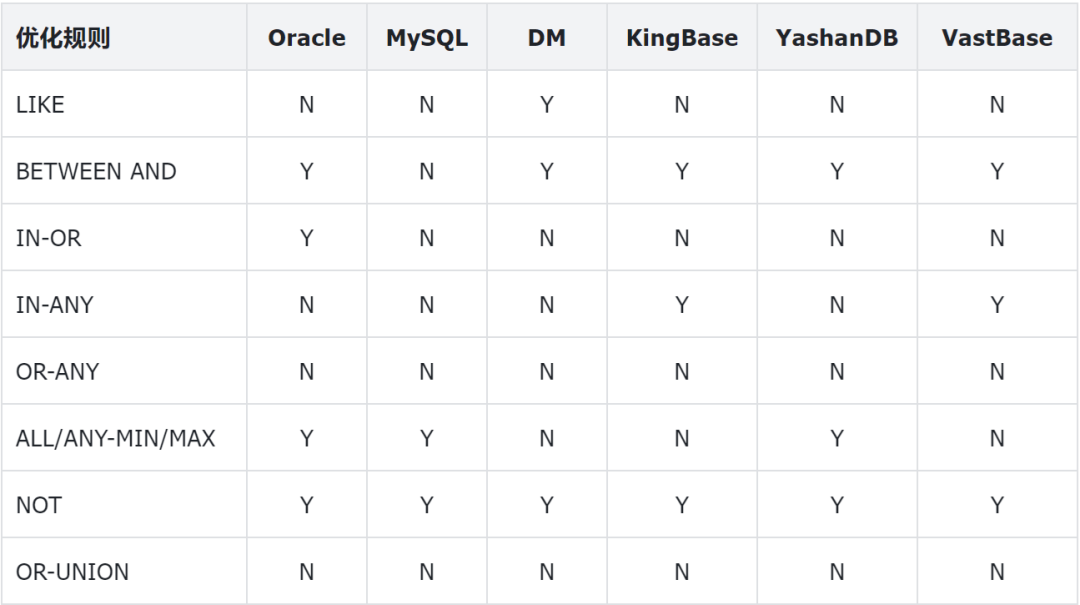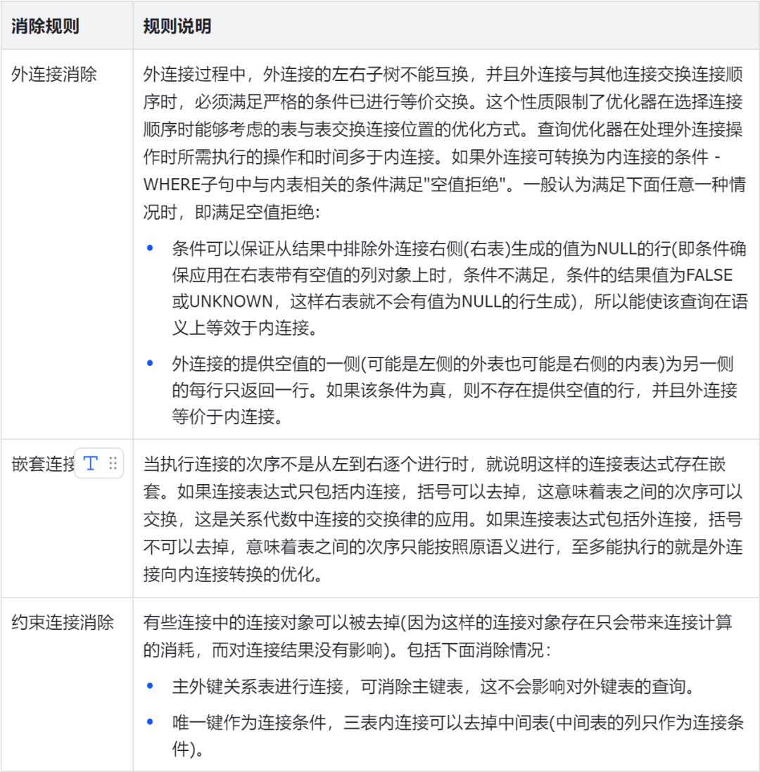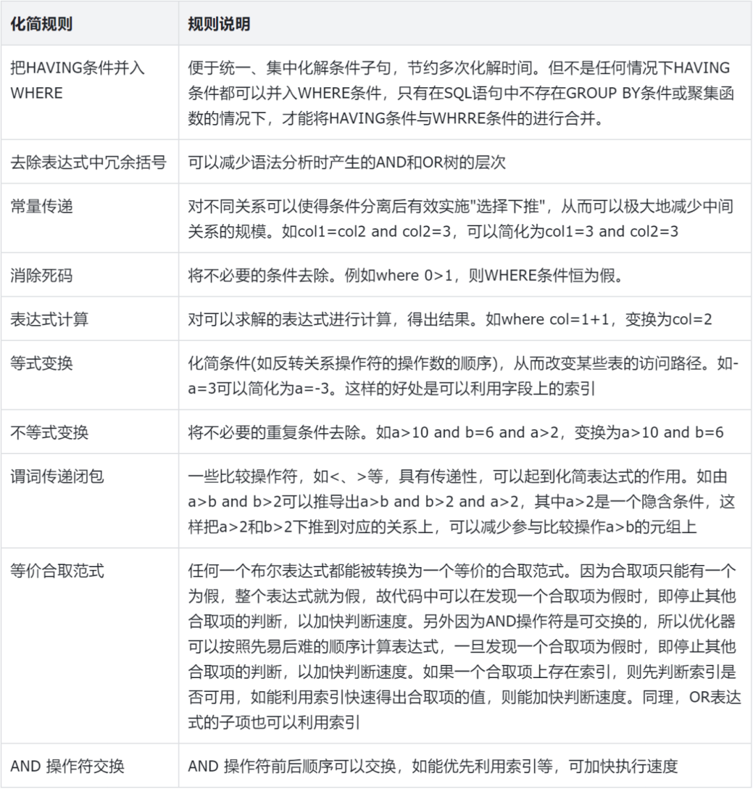 谓词重写,又称为等价谓词重写,是指将原执行效率低的谓词改写为效率高的谓词并重写SQL,从而提高SQL的整体执行效率的一种优化手段。其本质是在于不同谓词的处理效率存在差异所导致。常见的谓词重写规则如下